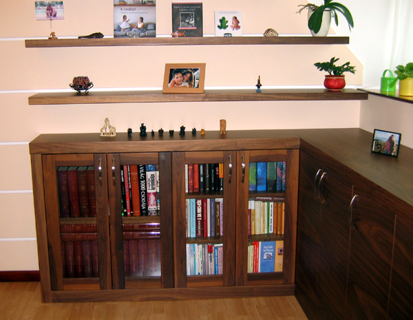 Egyedi kerti diófából készült könyvszekrény. Pácolt, lakkozott felületkezeléssel